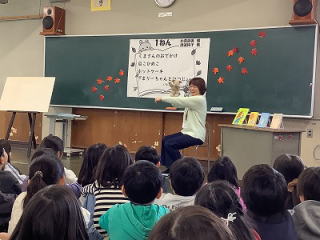 1年生は、学年合同で本の読み聞かせをしました。担任が魔女に扮して、子どもたちの気分を盛り上げていました。読んだ本は「焼きいも」の本です。みんなで一緒に掛け声をかける場面もあり、子どもたちは楽しく聴くことができました。 |