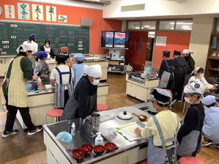 ![]() 5年生は、家庭科の学習で調理実習を行いました。だしを入れたおいしい味噌汁づくりをしました。具にはだいこん、長ネギ、あぶらげを用意しました。班の友達と協力しながら、一生懸命作っていました。 |
