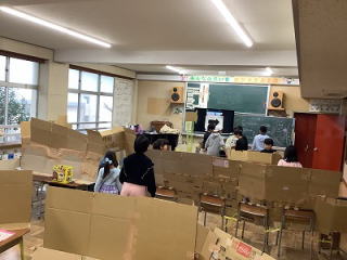 5年生は、図工の「糸のこスイスイ」の学習で、ホワイトボード作りをしています。電動のこぎりで思い思いの形に板を切り、それからデザインやホワイトボードの部分のシールをつけます。完成はもうすぐです。 |
