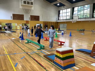![]() 1年生は、体育の時間に、体育館にコースを作っていろいろな動きを取り入れたサーキット練習をしていました。ろくぼくに上って横歩きをしたり、コーンのコースを後ろ向きで走ったりして体育館を1周します。みんな楽しそうに活動していました。 |