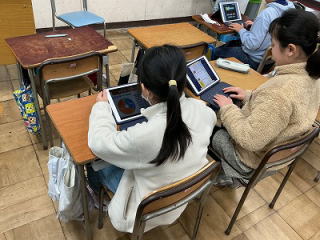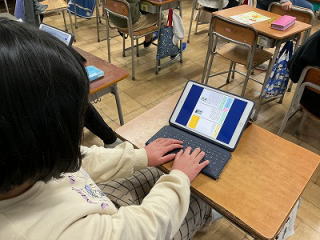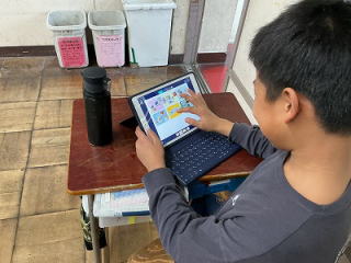 ![]() 課題が終わると、教室で読書をすることがありますが、低学年は図書館や学級文庫の本の他、アプリを使ってのタブレット読書もしています。そこでは4000冊以上の本を読むことができます。 |
