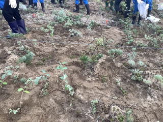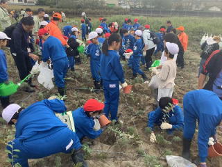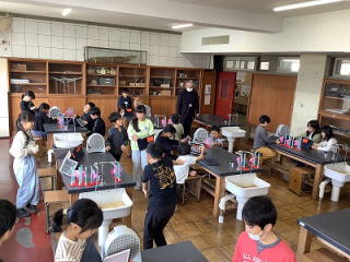 4年生は、ぐみの苗の挿し木を行いました。初めに、木を育てることで砂の害から環境を守ることに役立つという話を聞きました。その後中庭に移動し、植木鉢に挿し木をする作業を行いました。苗が大きくなったら海岸に植樹する予定です。