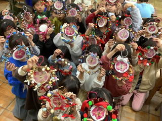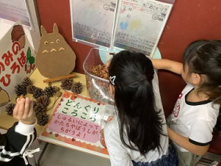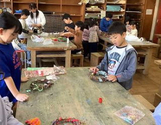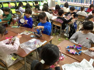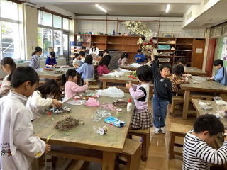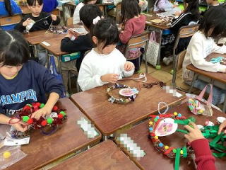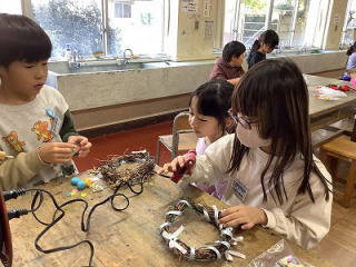 1年生は、大切の育ててきたアサガオのつるでリースを作り、秋の実や飾りをつけました。世界で一つしかない、素敵なリースができました。