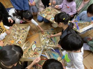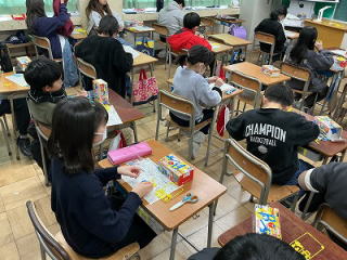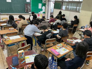 4年生は、図工の時間にコリントゲームを作っています。板にデザインと色塗りを終わった子どもたちは、枠の木材をのこぎりで切って、貼り付ける作業を行っていました。このあと、釘打ちをする予定です。