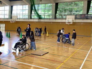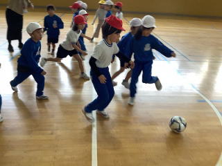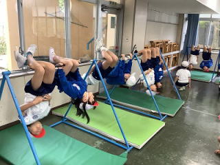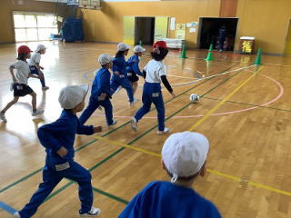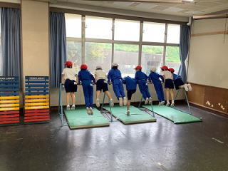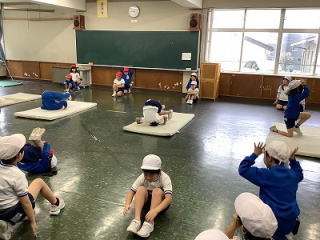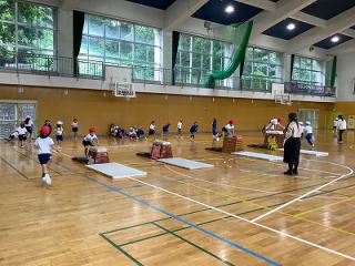 1年生は、体育の授業でリレー遊びを行いました。体育館の横を1往復したら、次の人にタッチします。どの子も元気よく走り抜いていました。
