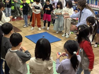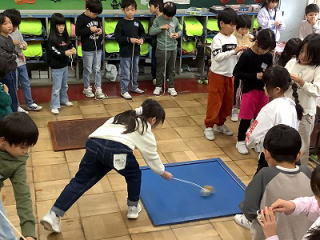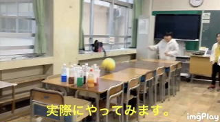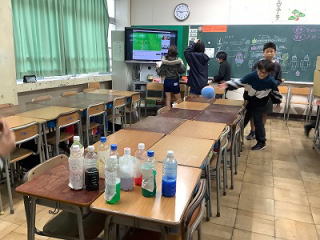 4年生は、理科で「空気と水」の学習を行っています。今日は、空気でっぽうを使って、玉が飛ぶ時の筒の中の空気の様子を確かめました。