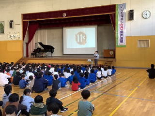 11月の児童朝会を行いました。今日は図書委員会とSGDS委員会の発表でした。図書委員会は、「ビブリオバトル」を行いました。SDGS委員会は「赤い羽根共同募金」についての呼びかけとクイズを行いました。