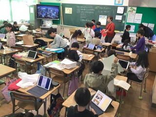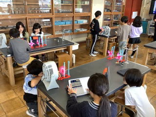 3年生は、理科で「風のはたらき」の学習をしました。風の強さを変えたり、風車の距離を変えたりすると、風車の回り方はどのように変わるのかを予想し、実験で確かめていました。実験の結果はロイロノートにまとめていました。