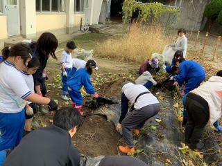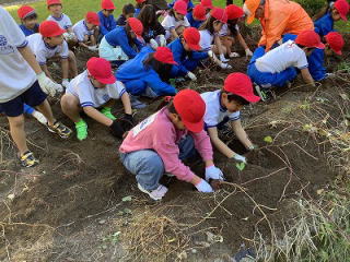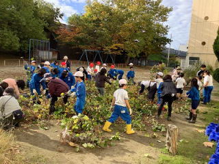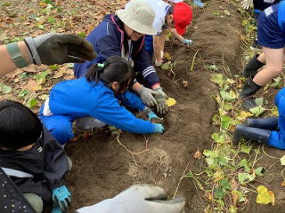 特別支援学級の子どもたちも合同でいもほりを行いました。最初につるを取り除き、次に、畝を覆っていたビニールをはぎました。それから一斉にいもほりを開始。大きなさつまいもがたくさん出てきて、子どもたちはとても嬉しそうでした。