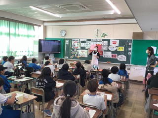 4年生は、社会で「ごみはどこへ」の学習をしています。この日は新潟市の係の方から、出前授業「ごみのお話」をしていただきました。新潟市のごみの現状や分別の仕方などを学びました。また、ごみ収集車がごみを回収する様子を見学することもできました。