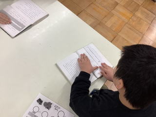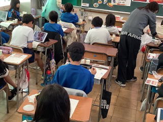 課題が終わると、教室で読書をすることがありますが、低学年は図書館や学級文庫の本の他、アプリを使ってのタブレット読書もしています。そこでは4000冊以上の本を読むことができます。