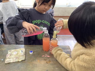 1年生は図工の時間に「カラフル色水」という学習を行いました。自分の色水を友達の色水と混ぜたり、魔法の水を入れて色の濃さを調節したりして、個性豊かなカラフル色水を作ることができました。子どもたちは張り切って作っていました。