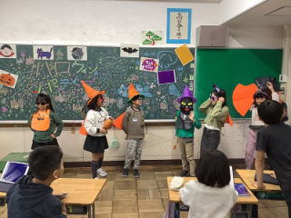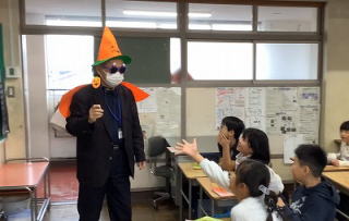 3年生は、学級活動でハロウィンパーティーを行いました。子どもたちは、お化けなどに仮装して、とても楽しそうに活動していました。先生も仮装していました。