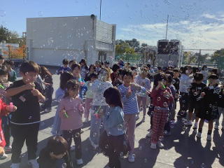 1年生は、学年みんなで屋上に行って、しゃぼん玉遊びをしました。七色に輝いてふわふわと舞うしゃぼん玉に、子どもたちは大興奮でした!