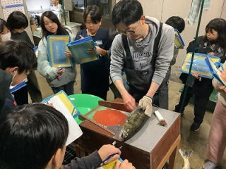 5年生は、サケ・マス増殖施設の見学をするために、阿賀町の阿賀野川漁協に行きました。子どもたちは、松浜の海で捕獲した鮭の増殖の仕方を知ることができました。鮭の卵を受精させる作業を、子どもたちはとても興味深く見ていました。