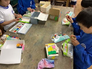 1年生は、図工の時間に「たいせつボックス」を作りました。空き箱を彩り、中に自分の好きなもの、お気に入りのものを紙粘土で作って入れました。