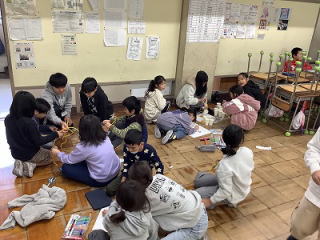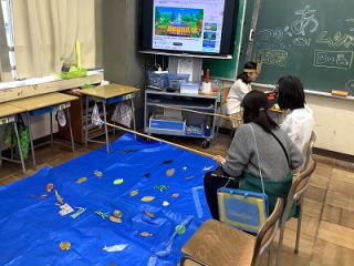 1年生は図工の時間に折り紙で「かいがら」の飾りを作りました。先生がテレビ画面で作り方を見せ、それを見ながら子どもたちは、一生懸命作っていました。