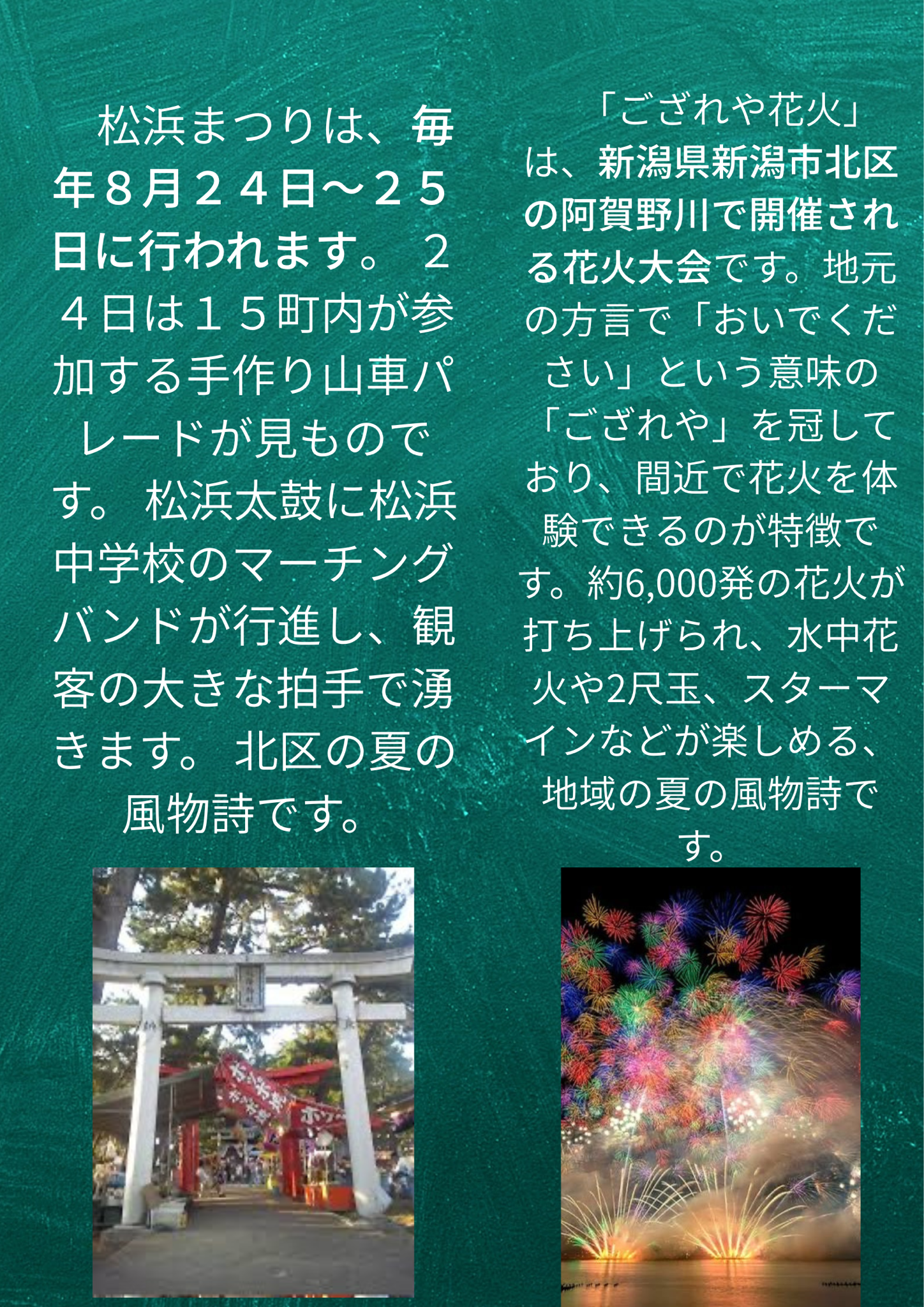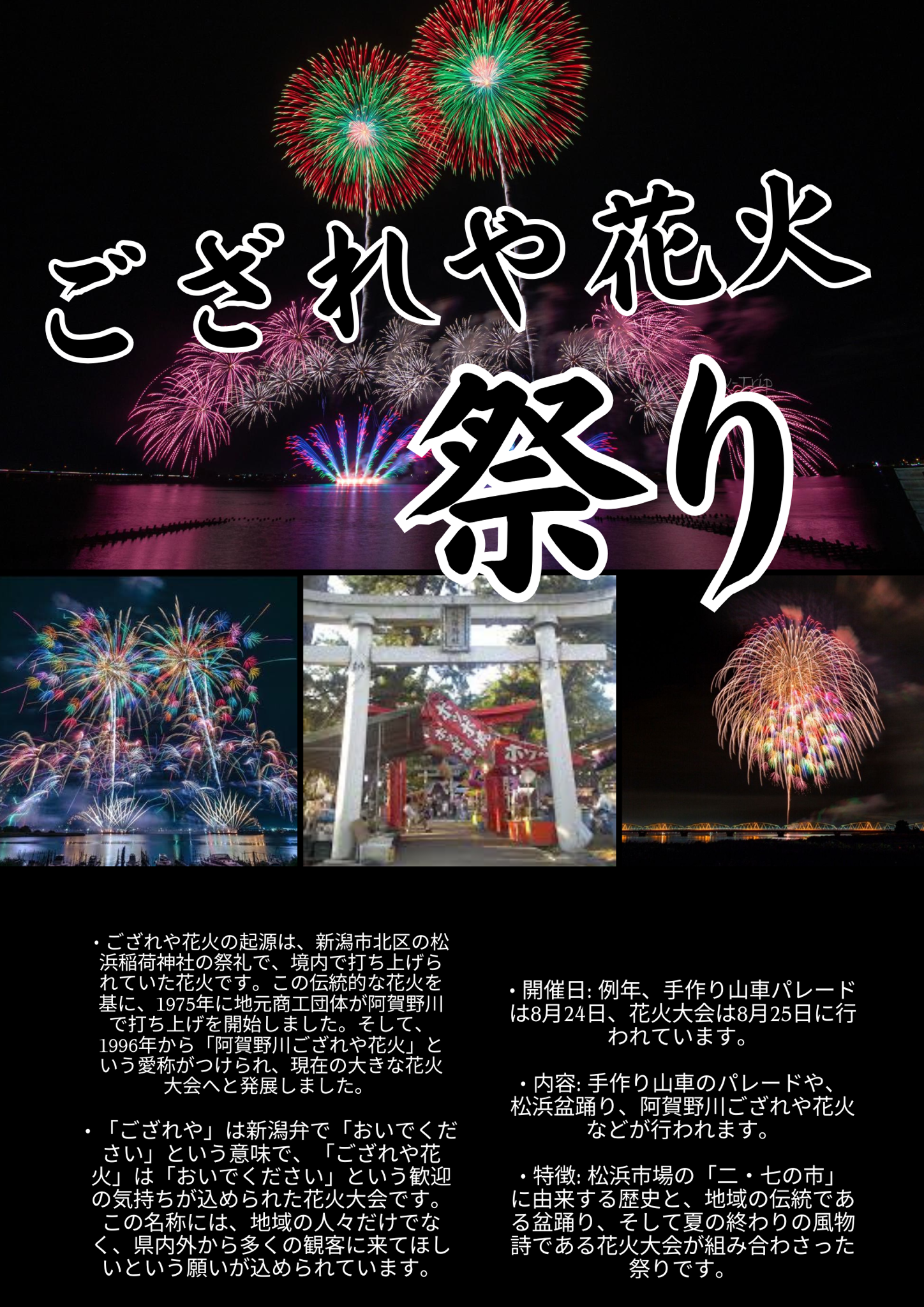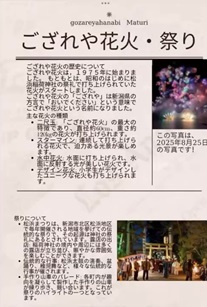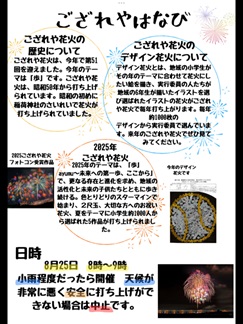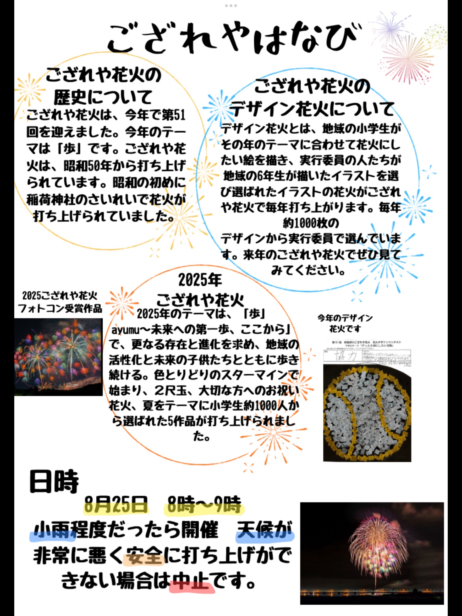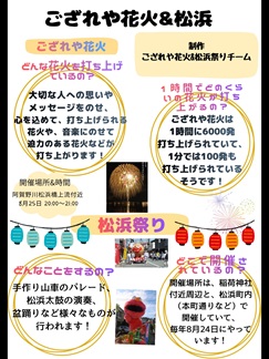 ござれや花火は,今年が51回目でした。毎年素晴らしい花火が見られるのは,実行委員の方々の頑張りがあるからです。松浜の宝の「ござれや花火・祭り」。今から来年の夏が楽しみですね!